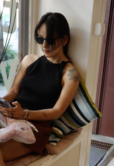 이효리는 선글라스와 함께 검은 색상의 원숄더 디자인의 상의에 브라운 컬러의 숏팬츠를 매치해주었어요.
