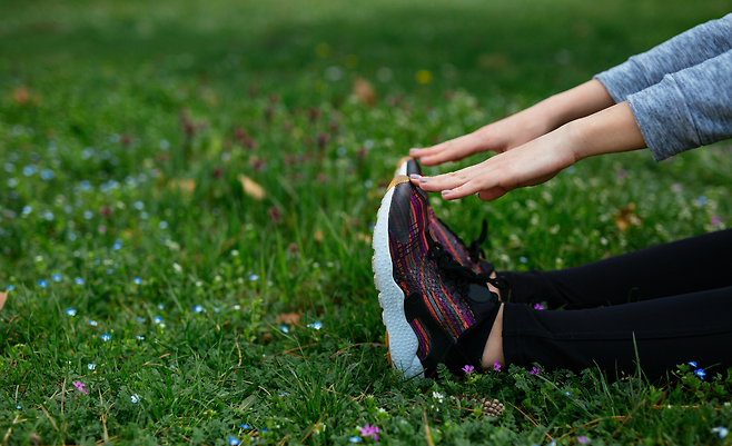 1. 바닥에 앉아 다리를 쭉 편다.