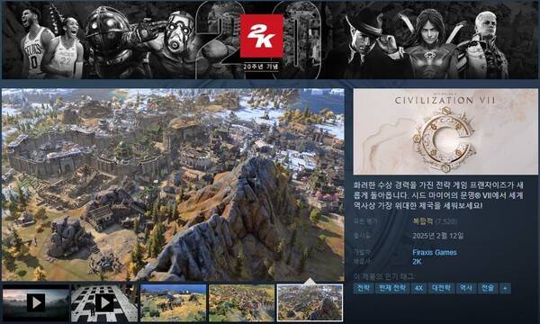 8일 오후 3시 기준, '문명7'의 스팀 사용자 평가는 총 7520개 리뷰 중 긍정적 평가 비율이 49%에 불과해 '복합적'을 기록하고 있다. 이는 전작인 '문명6'의 '매우 긍정적(약 25만 평가 중 86% 긍정적)', 시리즈 최고 명작으로 꼽히는 '문명5'의 '압도적으로 긍정적(약 12만 평가 중 95% 긍정적)'과 비교하면 초라한 성적이다. 다른 플랫폼에서의 평가는 아직 공개되지 않았지만 스팀에서의 혹평이 출시 전 기대감을 떨어뜨리고 있다.