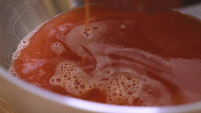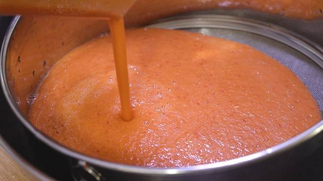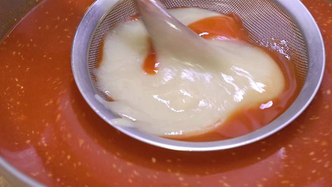 불려놨던 고춧가루 물과 소금물 그리고 물 1L를 추가로 계속 부어가며 즙을 내세요. 이 과정이 조금 귀찮고 힘들지만, 이렇게 낸 즙은 인공조미료로 따라올 수 없는 정말 맛있는 국물 맛을 내준답니다.