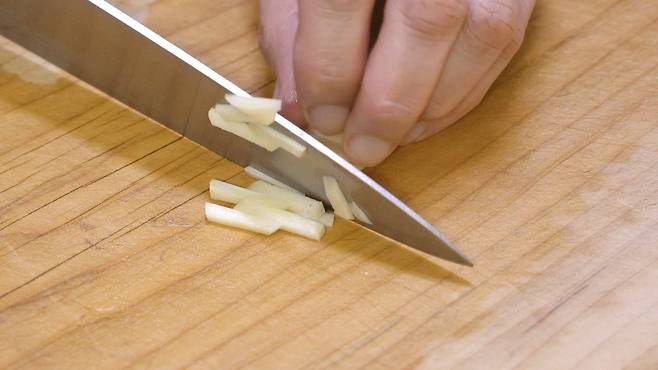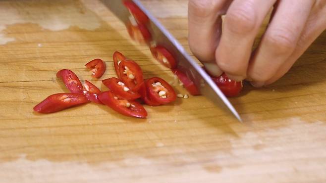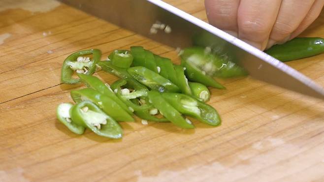 고추류는 어슷하게 썰고, 마늘은 채 썰기를 하여 준비하세요.