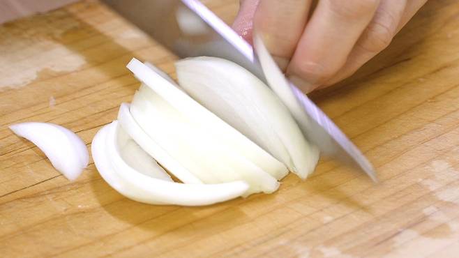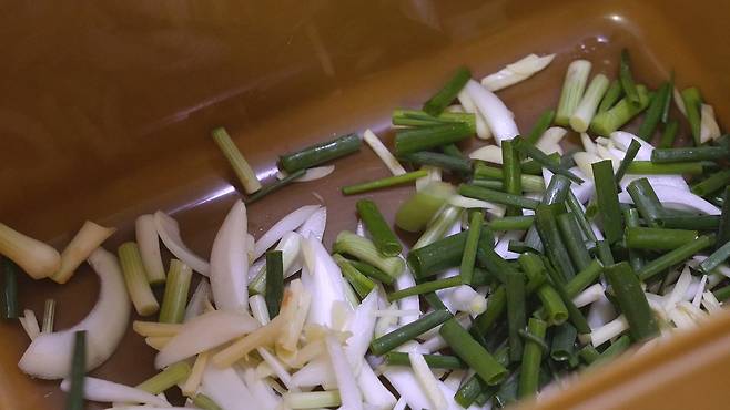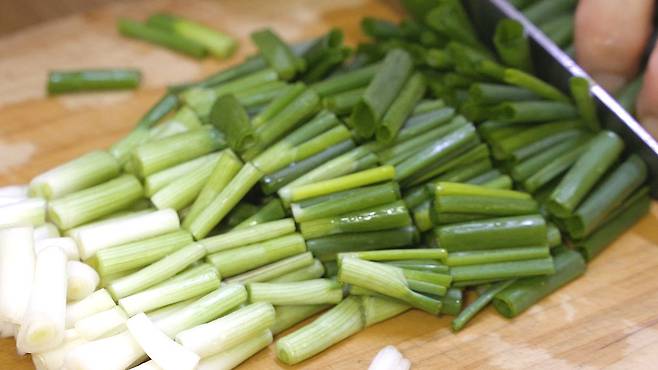 쪽파는 2~3센티 길이로 썰어 주고, 양파는 채 썰기를 하세요.
