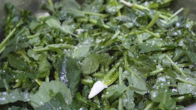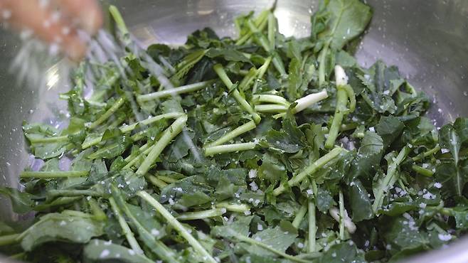 열무를 양푼에 한켜씩 넣고 천일염을 한켜씩 뿌려주세요. 총 1시간 10분 동안 절여 주세요. 그리고 중간에 전체적으로 골고루 절여지도록 한번 뒤집어 주는 것! 잊지 마세요.