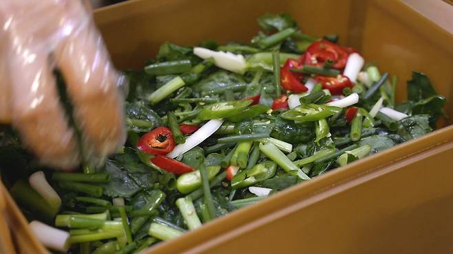 김치통 바닥에 썰어 놓은 야채 2/3를 넣고 물기 제거된 열무를 넣으세요. 가장 윗부분에 남은 야채를 모두 넣으세요.