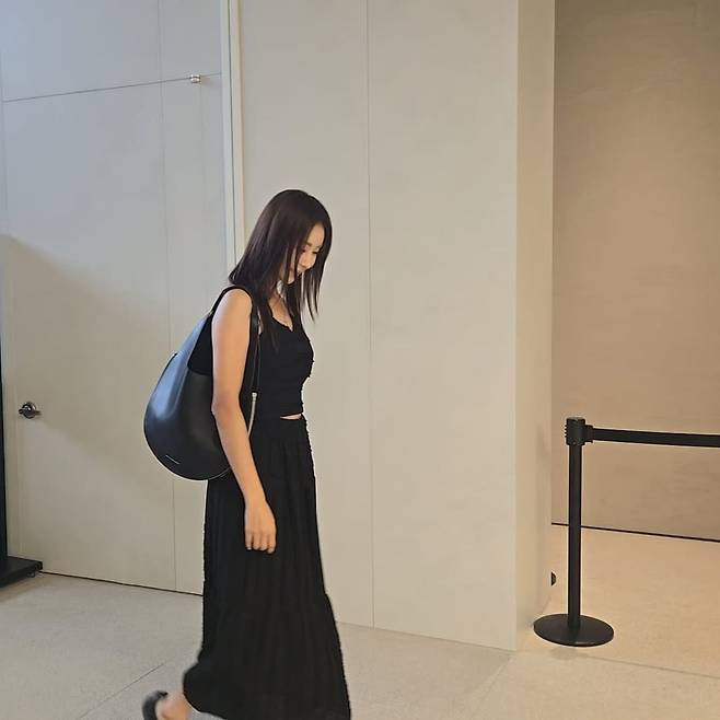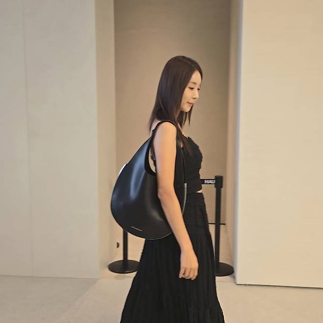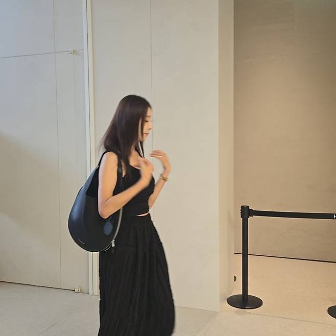 그녀가 선택한 착장은 블랙 슬리브리스 톱과 플리츠 롱 스커트의 조합이었다.