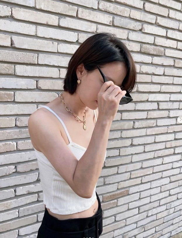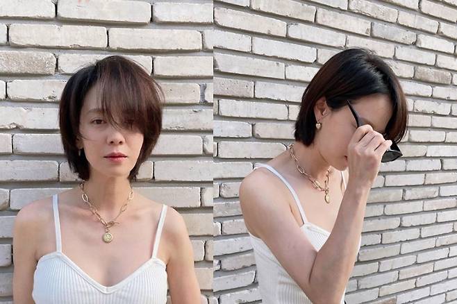 송지효는 숏컷 헤어에 골드 악세사리, 선글라스를 더해 시크한 분위기를 자아냈습니다