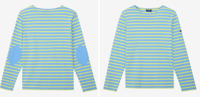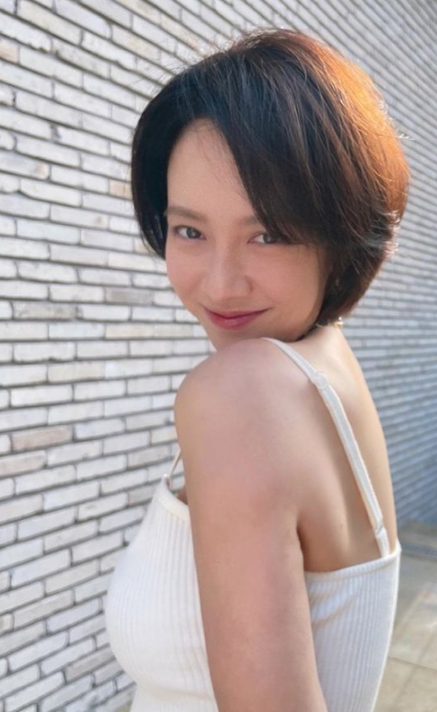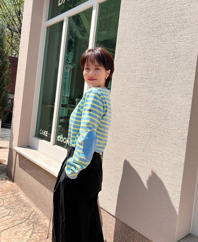 송지효는 숏컷 헤어를 자연스럽게 연출하고 스트라이프 티셔츠만으로 눈길을 끌고 있어요.