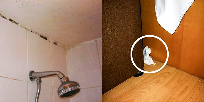 사진을 보면 낡고 관리가 전혀 되지 않은 카펫, 먼지가 가득 쌓인 창틀, 곰팡이 핀 욕실이 눈에 띕니다. "이 호텔이 비싸서 주저하고 있다면 캠핑을 가세요. 훨씬 더 나은 경험과 가치를 얻을 것입니다."라는 후기처럼, 차라리 야외에서 지내는 것이 더 나은 선택이라는 강한 충고가 이어졌습니다.
