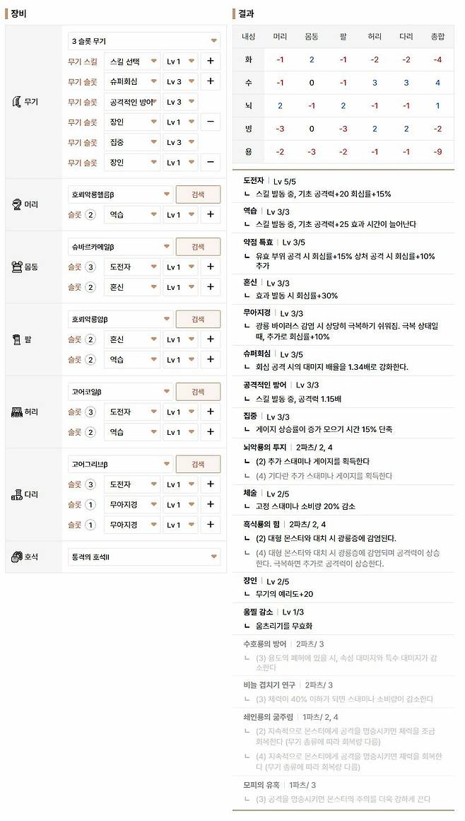 혼신, 역습도 선호도가 높다. 혼신 유지를 위한 추가 스킬 선택도 이어지는데, 체술을 가져가 스태미나 소비량을 줄이며 뇌악룡의 투지 2부위 장착으로 추가 스태미나 게이지를 마련하기도 한다. 플레이스타일에 따라 납도술, 발도술을 채용하기도 한다.
