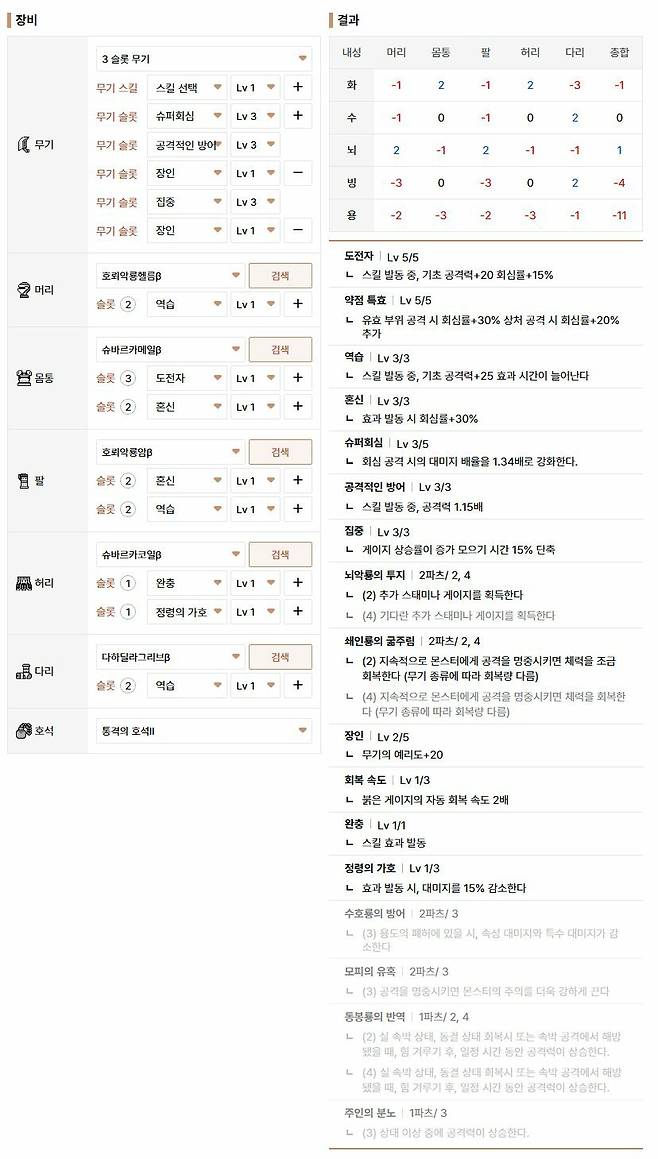 공격적인 방어와 집중, 그리고 슈퍼회심은 아티어 무기를 사용할 때 장신구 슬롯에 들어가는 하나의 세트로 자리한 모습이다. 초심주3. 수세-장인주, 집중-장인주를 통해 예리도까지 가져가는 것이 포인트. 공격적인 방어는 가드를 통해 딜 상승을, 집중은 모으기 시간 단축 효과를 가진 스킬로 대검과 잘 어울린다.