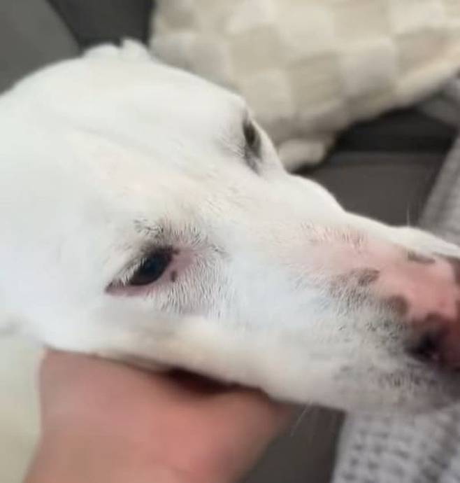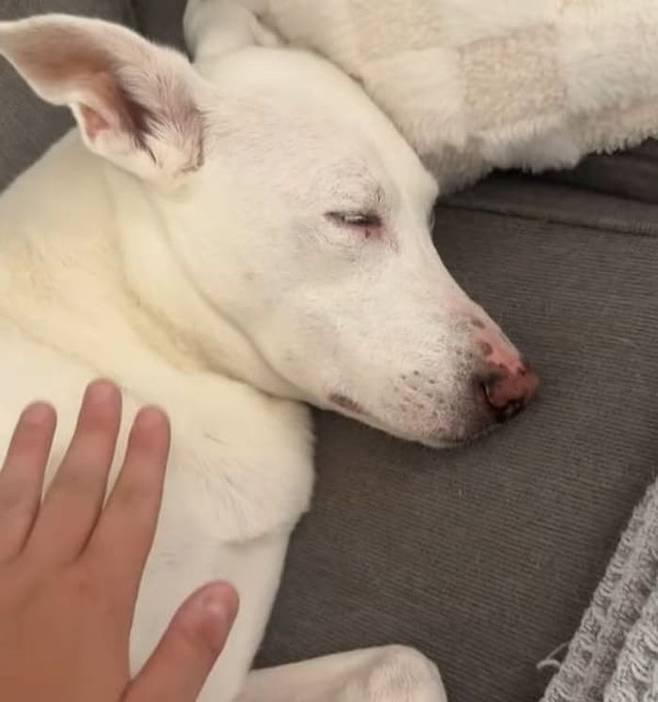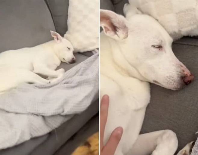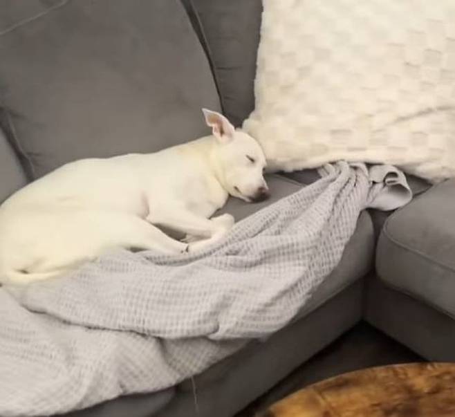 영상 속 장면은 참으로 인상적입니다. 소파 위에서 곤히 잠든 강아지 곁으로 주인이 살금살금 다가가 손을 내밀어 조심스럽게 몸을 쓰다듬기 시작했습니다.