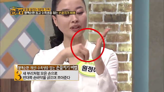 손 온도를 빠르고 확실하게 올리는 방법 중 하나는 손을 강하게 두드려 주는 건데요. 양손을 가슴 앞으로 가져와 손목을 까딱까딱 움직이며 손끝을 부딪쳐줍니다. 손을 새 부리처럼 모아 반대쪽 손을 쳐주면 더욱 강한 자극을 줄 수 있습니다. 이런 동작은 손끝의 말초신경을 자극해 냉증을 해소하거나 관절 통증을 완화하는 데 큰 도움이 됩니다.