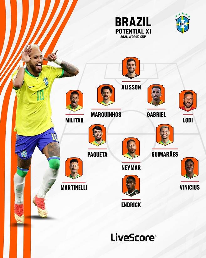 축구 통계 사이트 ‘Live Score’는 21일 브라질의 2026 북중미 월드컵 예상 라인업을 공개했다.