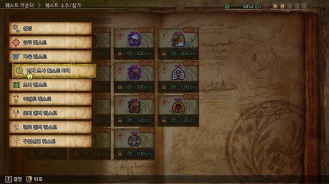 기본적으로 조사 퀘스트는 지도를 살펴보는 것부터 시작하면 된다. 지도를 열고 월드 맵에 들어가 각 지역을 보면, 해당 지역에서 지금 공략 가능한 몬스터들이 표기된다. 처치하고자 하는 몬스터가 있을 경우, 세부 내용을 눌러 해당 몬스터를 퀘스트화하고 지금 바로 현지 조사 퀘스트를 시작할 것인지, 아니면 조사 퀘스트로 저장할 것인지 결정할 수 있다.
