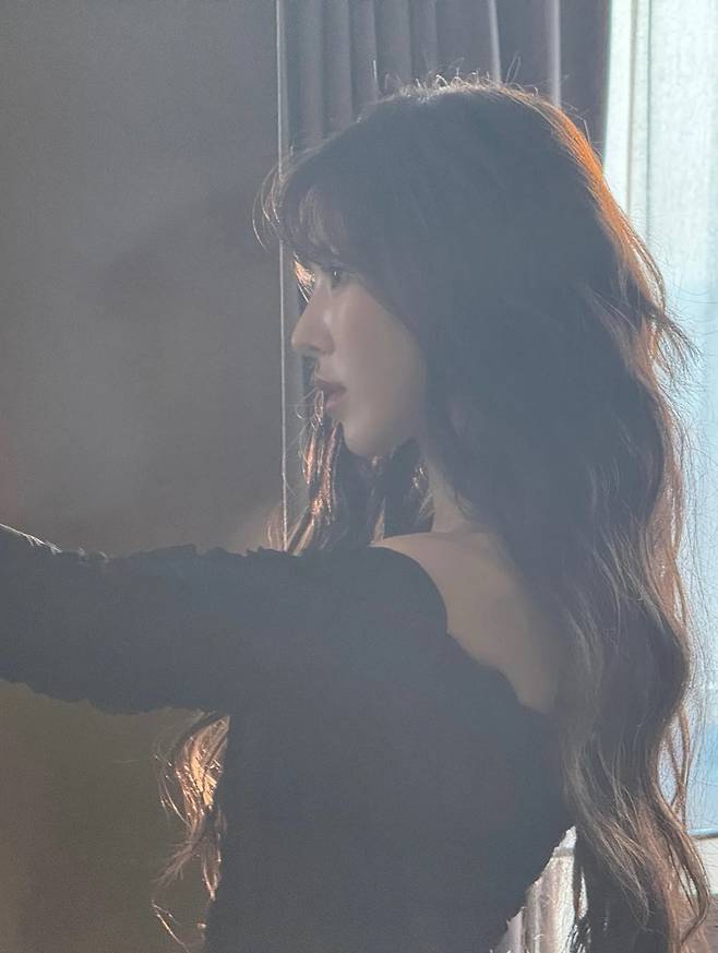 쇄골 라인을 강조한 블랙 오프숄더 드레스와 자연스러운 웨이브 헤어가 돋보이는 웬디의 측면 실루엣. /사진=웬디 인스타그램