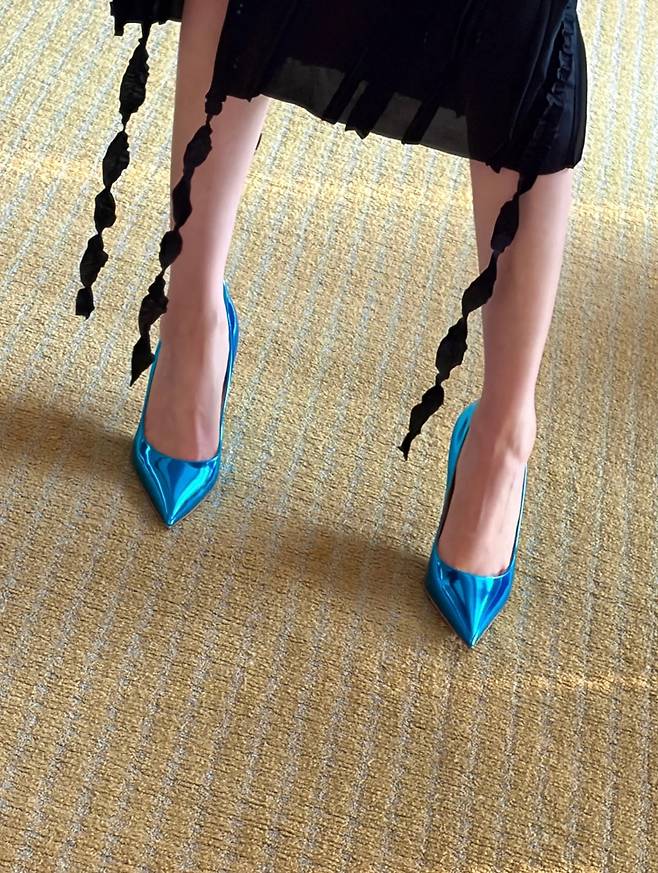 세 번째는 룩 전체의 반전 매력을 선사하는 시선을 사로잡는 파란 하이힐이다. 크리스찬 루부탱 특유의 유려한 쉐입과 메탈릭한 질감이 돋보이는 비비드 블루 컬러가 블랙 드레스와 극명한 대비를 이루며 룩 전체의 임팩트를 완성한다. 발끝의 포인트 하나만으로 분위기 전환이 가능한 대표적인 아이템으로, 시크함과 동시에 럭셔리한 무드를 연출하는 데 탁월한 선택이다.