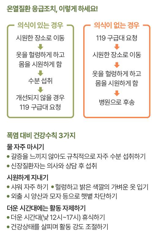 지영미 질병관리청장은 “온열질환은 건강수칙을 잘 지키는 것만으로도 상당부분 예방할 수 있으므로 폭염 시 야외작업, 운동 등 실외활동을 자제하고 충분히 물을 마시고 주기적으로 휴식하는 등 주의가 필요하다”고 강조했습니다.