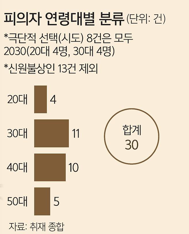 눈에 띄는 점은 2030이 범행 주체인 경우가 많다는 점이다. 43건 중 신원이 확인되지 않은 사건(13건)을 제외한 30건 중 15건(50%)이 2030이 저지른 범죄였다. 극단적 선택을 했거나 시도했다 실패한 8명은 모두 2030이었다.