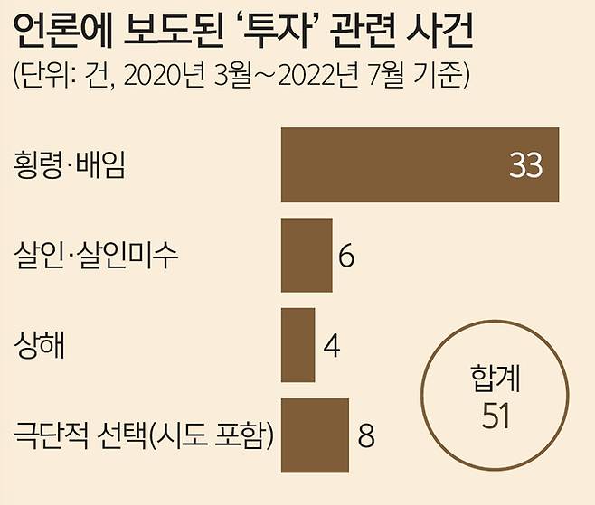 7일 세계일보가 신종 코로나바이러스 감염증(코로나19)이 발생한 직후인 2020년 3월부터 2022년 7월까지 언론에 보도된 형사사건을 분석한 결과 ‘투자’가 범행동기인 사건이 총 43건으로 파악됐다. 한 달에 1.5번은 투자실패 때문에, 혹은 투자금 마련을 위해 범행이 이뤄진 것이다. 혐의는 살인과 살인미수, 상해, 폭행, 횡령, 배임으로만 한정했다. 극단적 선택(시도 포함) 8건을 포함하면 그 수는 51건으로 늘어난다.