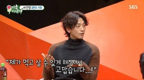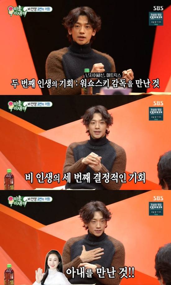 방송된 SBS '미운 우리 새끼'에 비가 스페셜 게스트로 출연해 박진영, 영화감독 릴리 워쇼스키와 라나 워쇼스키, 배우 김태희를 향한 고마움을 전했습니다.