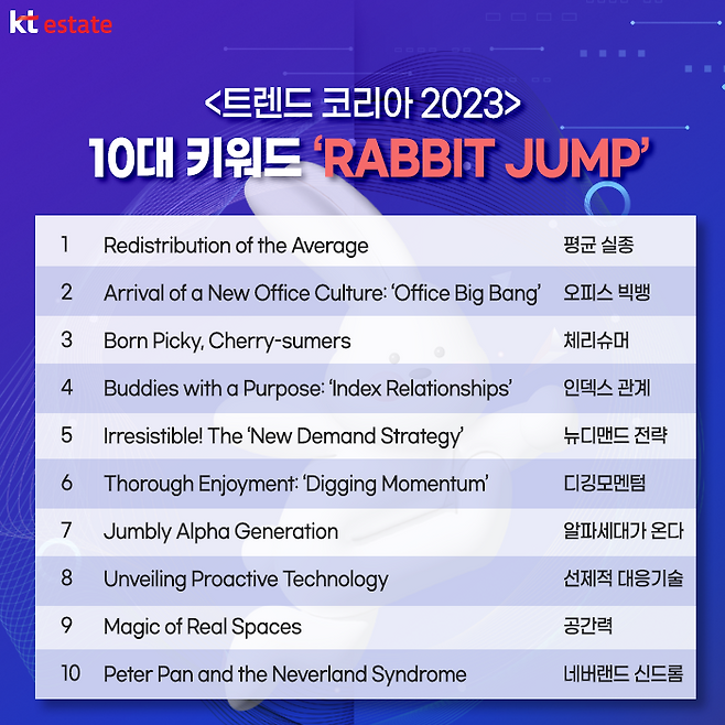 지금까지 내년 부동산시장에서 유행할 다양한 트렌드를 살펴봤는데요. <트렌드 코리아 2023>에서는 이 외에도 ‘인덱스 관계’, ‘뉴디맨드 전략’, ‘알파세대가 온다’, ‘선제적 대응기술’, ‘공간력’, ‘네버랜드 신드롬’ 등의 키워드가 내년 우리 사회에서 주목해야 할 키워드라 밝힌 바 있습니다.