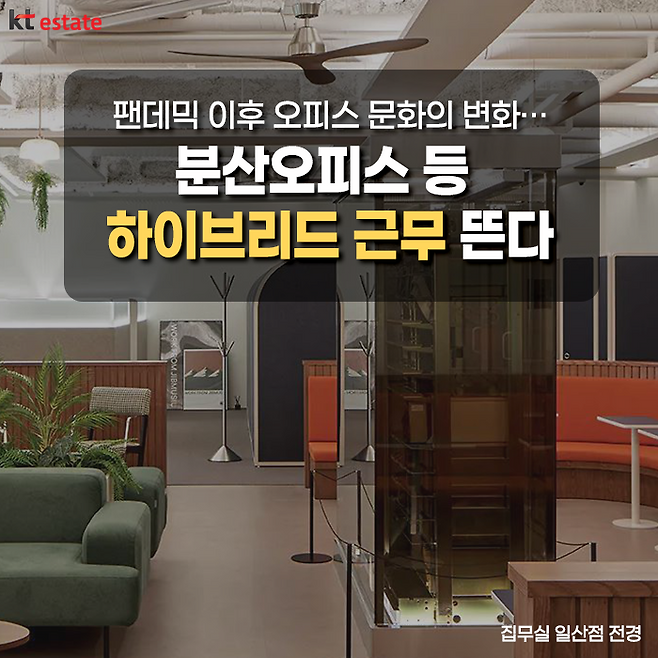 이에 내년에는 출근, 재택 또는 분산(거점)오피스 등 다양한 근무 방식이 뒤섞인 ‘하이브리드 근무(Hybrid work)’가 업무 문화에서 대세를 이룰 것으로 판단되는데요. 최근 기업들은 주요 거점별로 분산 오피스를 두는 추세가 높아지고 있습니다. 대표적으로 1기 신도시인 일산에는 분산 오피스인 ‘집무실 일산점’이 유명한데요. 집무실 일산점은 우리나라 대표적 1기 신도시인 일산에 자리해 직주근접이란 장점 외에도 세련된 인테리어와 다양한 워크 모듈로 업무 효율을 높이는 것으로 잘 알려졌습니다.