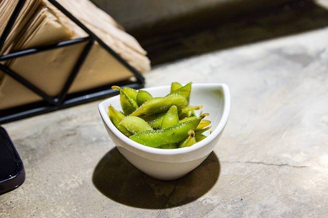 자리를 잡은 후 술을 잘 못하는 나는 가장 적절한 도수로 음식과 함께 즐길 수 있는 유자 사케와 모둠회를 함께 주문했다. 사케는 숙성회와 그 궁합이 정말 좋은 듯해서 입에 침이 살짝 돌 정도. 바로 웰컴 푸드처럼 가벼운 음식으로 풋콩(에다마메)을 내 준다.