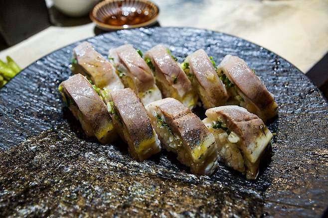 다음 주문한 것은 이 집에서 먹어보고 싶었던 고등어봉초밥이었다. 그런데 당일 아지(전어)가 좋다고 하면서 아지봉초밥으로 변경했다. 그런데 솔직히 아지봉초밥은 생각했던 수준은 아니었다. 그래도 깔끔하게 마무리하기에 좋은 메뉴가 아닌가 싶다.