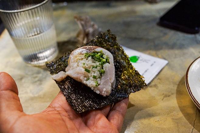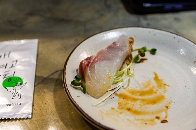 모둠회가 한 접시 나왔다. 제대로 잘 숙성한 숙성회였다. 회가 폭신하니 숙성회의 감칠맛이 뛰어났다. 그런데 회와 함께 나온 것 중에서 특별히 맛있었던 것은 따뜻할 때 바로 먹어야 하는 전복이었다. 내장 크림이 올라가 있었는데 정말 맛있었다. 한입 가득 전복의 풍미와 함께 따뜻한 전복구이의 맛이 즐겁다. 유자 사케로 입을 씻어내니 그다음 회가 또 한 점 들어오면서 맛있게 즐길 수 있었다.