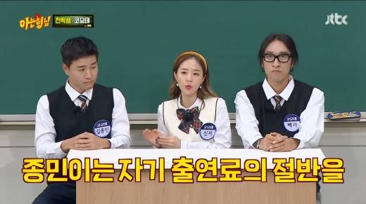 그러자 신지는 “우리가 출연료를 받고 공연을 할 거 아니냐”라며, “종민이는 자기 출연료의 3분의 1에서 3분의 2가량을 티켓값으로 다 썼다”라고 폭로해 놀라움을 자아냈다.