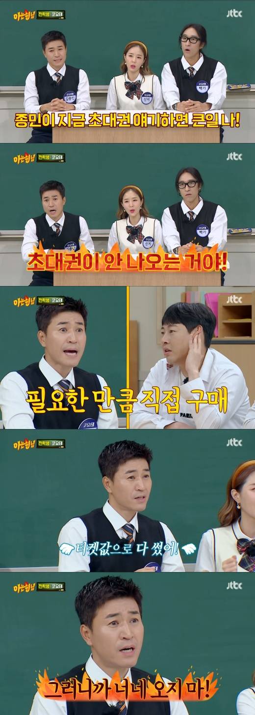 김종민은 “(초대권을 직접) 사야 되는 거다. 달라고 하는데 친한데 어떻게 안 주냐”라며, “그래서 준다고 준다고 계속 줬다. 그랬더니 60장이 넘어가는 거다”라고 털어놨다.