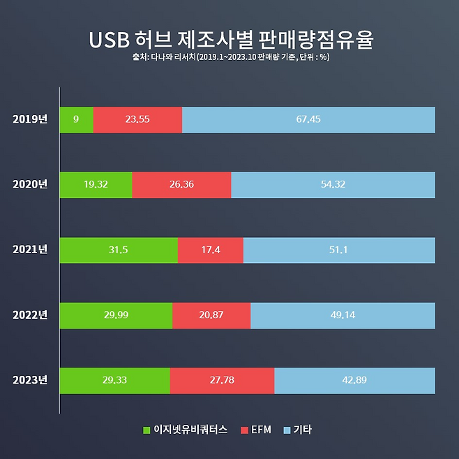 USB 허브 제조사별 판매량 점유율은 EFM 네트웍스와 이지넷유비쿼터스의 라이벌전이다. 그래프만 놓고 보면 정말 드라마틱하다. 2019년에는 불과 9%였던 이지넷유비쿼터스는 2021년 31.5%까지 올라 기존 1위였던 EFM의 자리를 빼앗았다. 정말 빠른 속도로 급성장한 것이다. 이에 2023년 들어 EFM의 대추격이 시작되었지만, 아직 약 2% 정도 우위를 차지하고 있다.