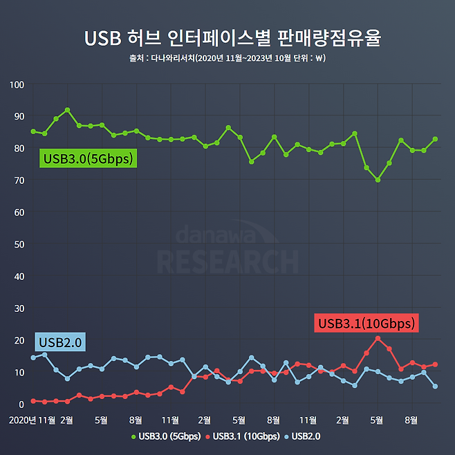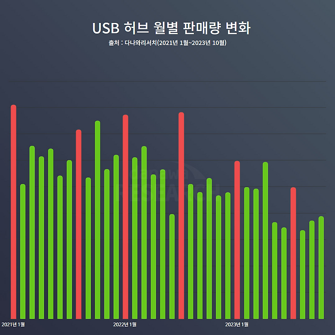USB 허브의 판매량은 2020년 이래 지속적으로 감소 중이다. 특히 2023년 들어서는 낙폭이 더 가팔라진다. 2023년 10월에는 2년 전 대비 약 36% 정도 낮은 판매량을 기록했다. 이런 추세는 USB 연결 장비 감소가 많은 영향을 끼친 것으로 파악된다.