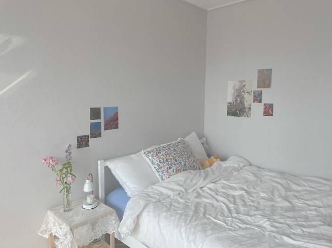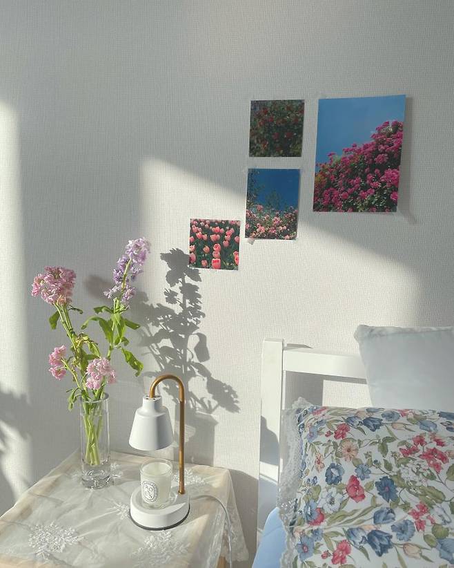 침대 위쪽에는 맘에 드는 꽃 엽서가 많이 없어서