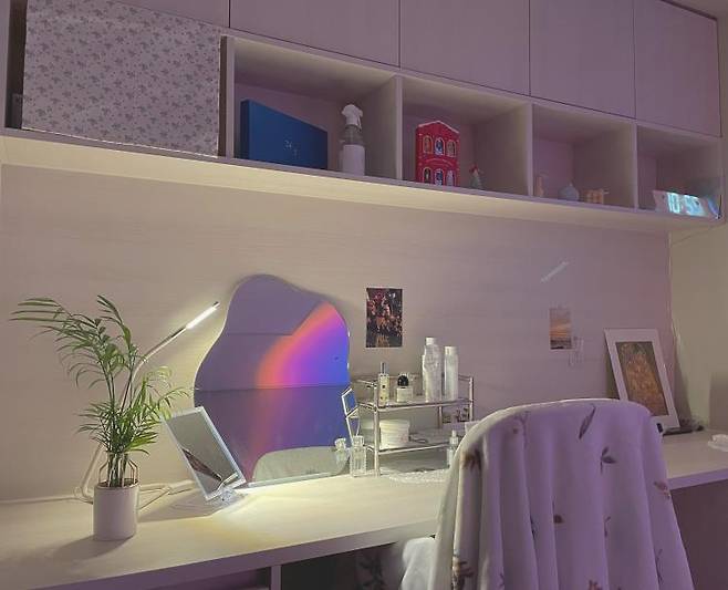이쪽은 책상인데요. 긴 책상 공간을 반으로 나눠 한쪽은 화장대로 사용하고 있습니다!