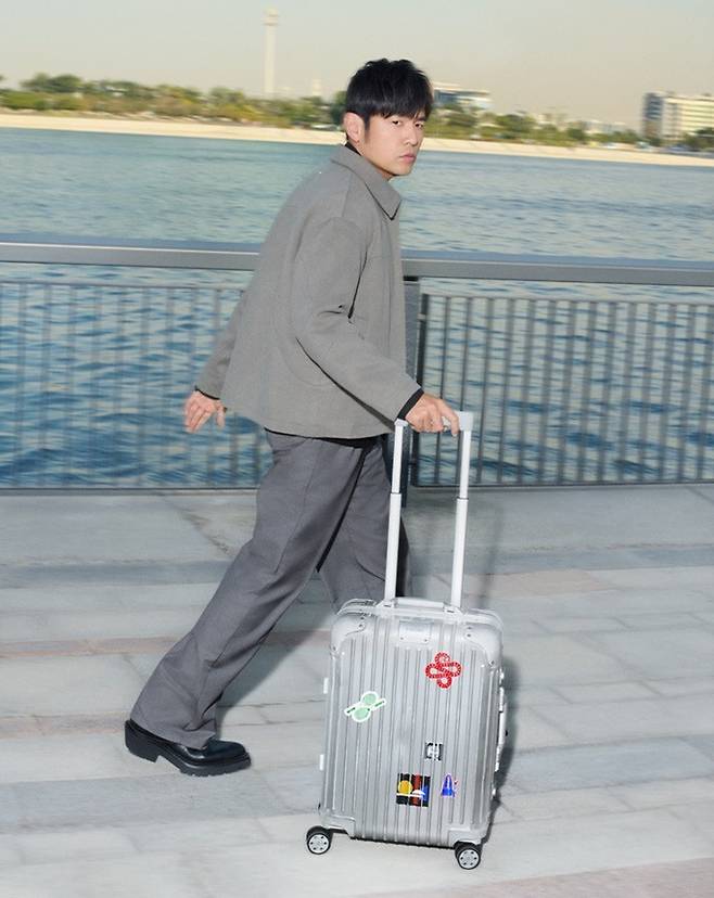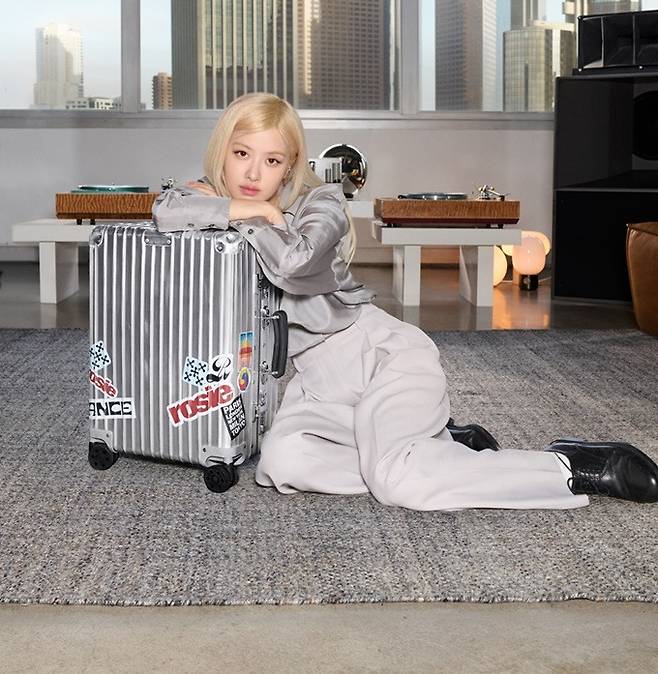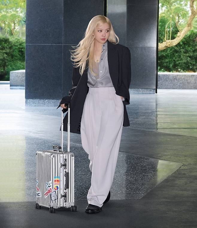 세계적인 슈터스타 로제는 파워우먼 오피스룩으로 새 앨범을 헌정하는 듯한 듯한 스티커가 부착된 캐리어를 끌고 집과 여행의 의미를 포착했다.
