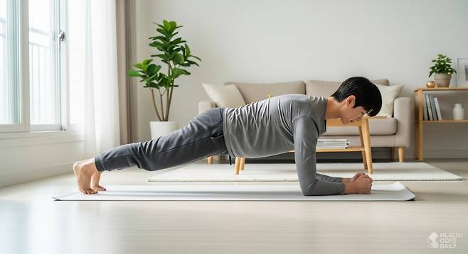 몸을 판자처럼 곧게 유지하는 플랭크는 전신을 단단하게 만드는 대표적인 등척성 운동이다. 복부를 중심으로 늑골, 척추, 골반을 연결하는 코어 근육이 강화되어 몸의 중심을 안정시킨다. 이 근육들은 척추를 지탱하고 자세를 바로잡는 데 관여하기 때문에 허리 통증 예방과 자세 교정에도 효과적이다.