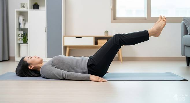 바닥에 등을 대고 누워 다리를 곧게 편다. 손은 몸 옆에 두고 복부에 힘을 주며 다리를 천천히 들어 올려 90도 각도를 만든다. 허리가 바닥에서 뜨지 않도록 조심하면서 다리를 다시 내리다가 45~10도 지점에서 멈춘다. 그 상태로 10~30초간 유지한 뒤 천천히 다리를 올리는 동작을 10회씩 3세트 반복한다.