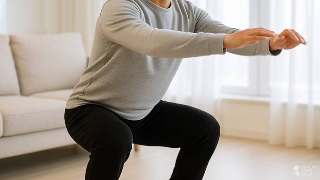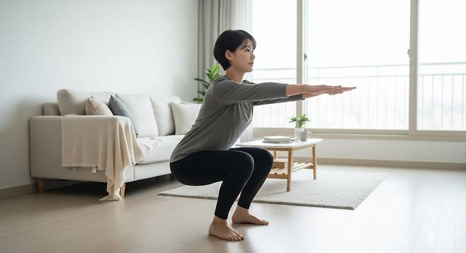 일반적인 스쿼트가 반복 동작을 통해 하체를 단련하는 운동이라면, 스쿼트 홀드는 하강한 자세를 유지해 버티는 등척성 운동이다. 허벅지와 엉덩이 근육을 중심으로 하체의 근지구력을 키우고, 코어를 함께 강화해 전신의 균형과 안정성을 높인다. 하체의 큰 근육을 사용하기 때문에 체지방을 태우는 효과가 크며, 탄탄한 하체 라인을 만드는 데도 유리하다.