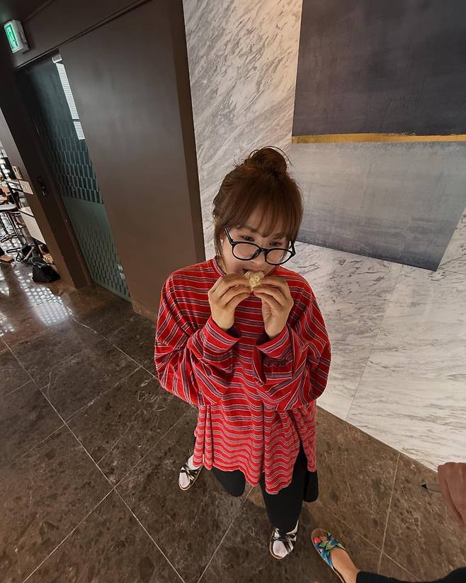 레드 베이스의 스트라이프 오버핏 셔츠로 편안하면서도 트렌디한 캐주얼 룩을 연출하고 있다. 블랙 안경과 번 헤어스타일이 지적이면서도 친근한 이미지를 만들어내며, 오버사이즈 핏으로 여유로운 실루엣을 강조하고 있다. 손에 든 간식과 함께 일상적이면서도 스타일리시한 모습을 보여주고 있다.