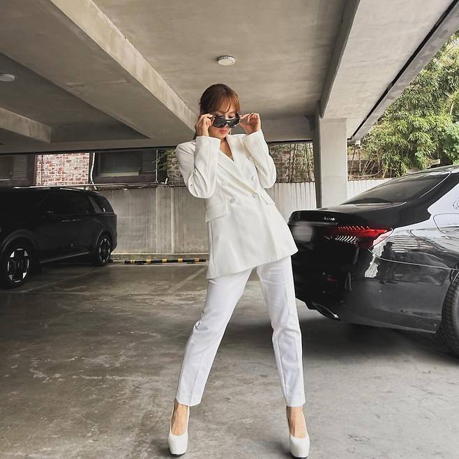 올 화이트 수트로 모던하고 시크한 비즈니스 룩을 연출하고 있다. 선글라스를 착용해 쿨한 분위기를 더했으며, 깔끔한 화이트 컬러 매치로 세련되고 도시적인 이미지를 완성하고 있다. 지하주차장이라는 공간과 어우러져 도심 속 워킹우먼의 모던한 매력을 보여주고 있다.