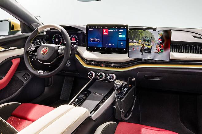 인테리어는 슈코다의 전통 색상인 빨강, 흰색, 금색, 검정이 조화를 이루며, 재활용 소재로 제작됐다. 앞좌석에는 '130 Years' 자수가 새겨졌으며, 대시보드에는 팀 데이터 전용 디스플레이가 탑재됐다.