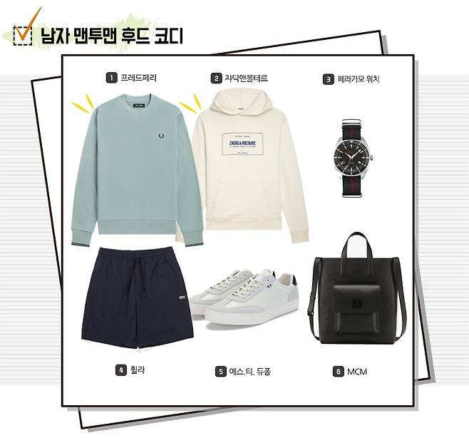 먼저 반바지와 함께하는 맨투맨 후드티 코디로 시작해볼게