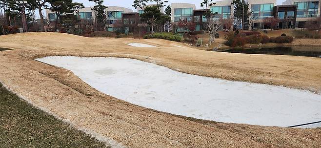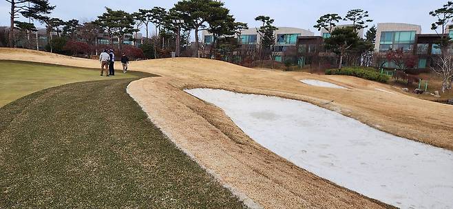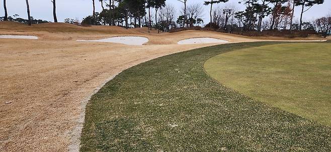 벤트그라스 그린 및 에이프런은 여전히 초록색을 유지하고 있네요. 페어웨이를 만나는 부분은 모래가 약간 많아서 드롭 플레이를 권합니다.