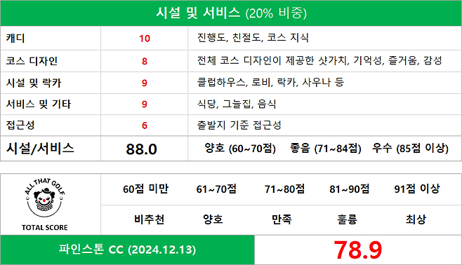 - 코스: 파인스톤 CC - https://www.pinestonecc.com/ - 날짜: 2024년 12월 13일 (금) - 티 박스: 화이트 - 그린피: 188,000원 - 캐디/카트: 15만원 / 10만원