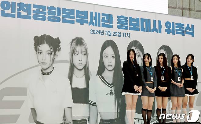 (인천공항=뉴스1) 장수영 기자 = 그룹 뉴진스의 혜인(왼쪽부터)과 하니, 다니엘, 해린, 민지가 22일 오전 인천국제공항 1터미널 밀레니엄홀에서 열린 인천공항세관 홍보대사 위촉식에서 홍보대사증을 목에 걸고 포즈를 취하고 있다. 2024.3.22/뉴스1