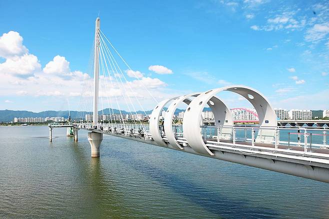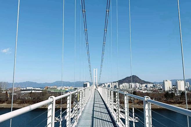 특히 다리 끝부분에는 탁 트인 전망을 즐길 수 있는 포인트가 마련되어 있어, 춘천의 하늘과 강을 배경으로 멋진 사진을 남기기 좋습니다.