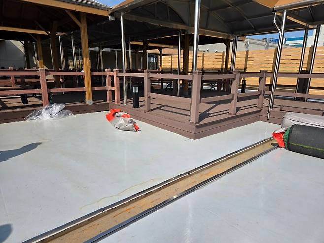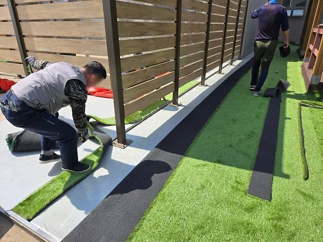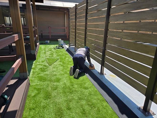 구조물에 맞춰 마무리까지 꼼꼼하게 재단하고 설치하면… 짜잔! 드디어 옥상 변신 완료!