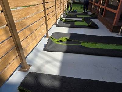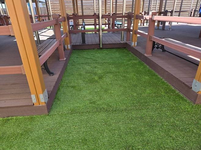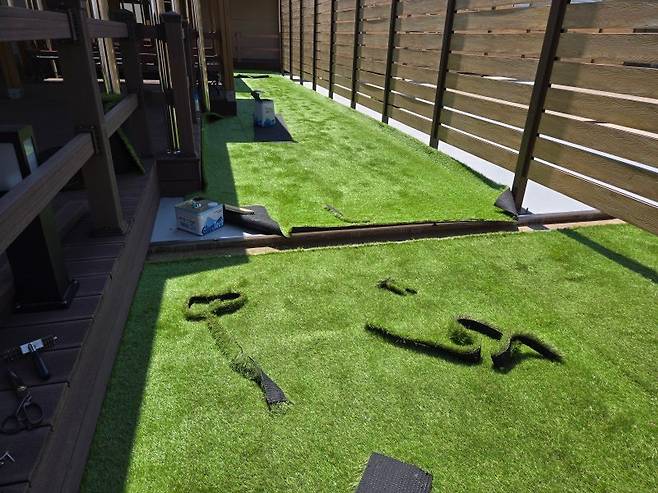 이제부터는 섬세한 작업이 필요합니다. 잔디를 바닥 모양과 구조물에 맞춰 꼼꼼하게 재단해야 하죠. 특히 기둥 주변이나 모서리 부분은 더욱 신경 써서 작업해야 깔끔한 결과물을 얻을 수 있습니다.