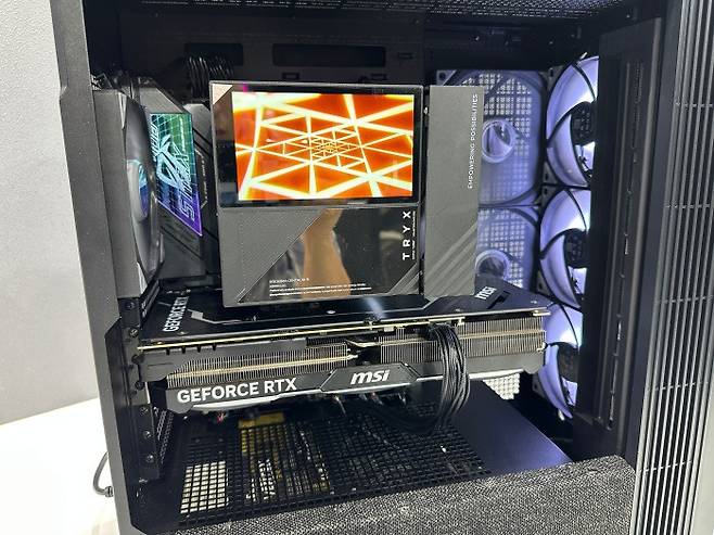 전면에 배치된 5인치 LCD는 TRYX의 통합 컨트롤 소프트웨어 'KANALI'를 통해 사용자 취향에 맞는 스타일로 커스터마이징이 가능하다. 시스템 상태를 표시하거나 GIF, 영상 콘텐츠를 출력하는 용도로 활용 가능하다. 전시장에서 직접 소프트웨어를 조작해 영상을 교체해 봤는데 직관적인 구조로 설계되어 처음 접하는 사람도 쉽게 수정할 수 있었다. 클릭과 동시에 영상이 교체되어 속도까지 쾌적했다.